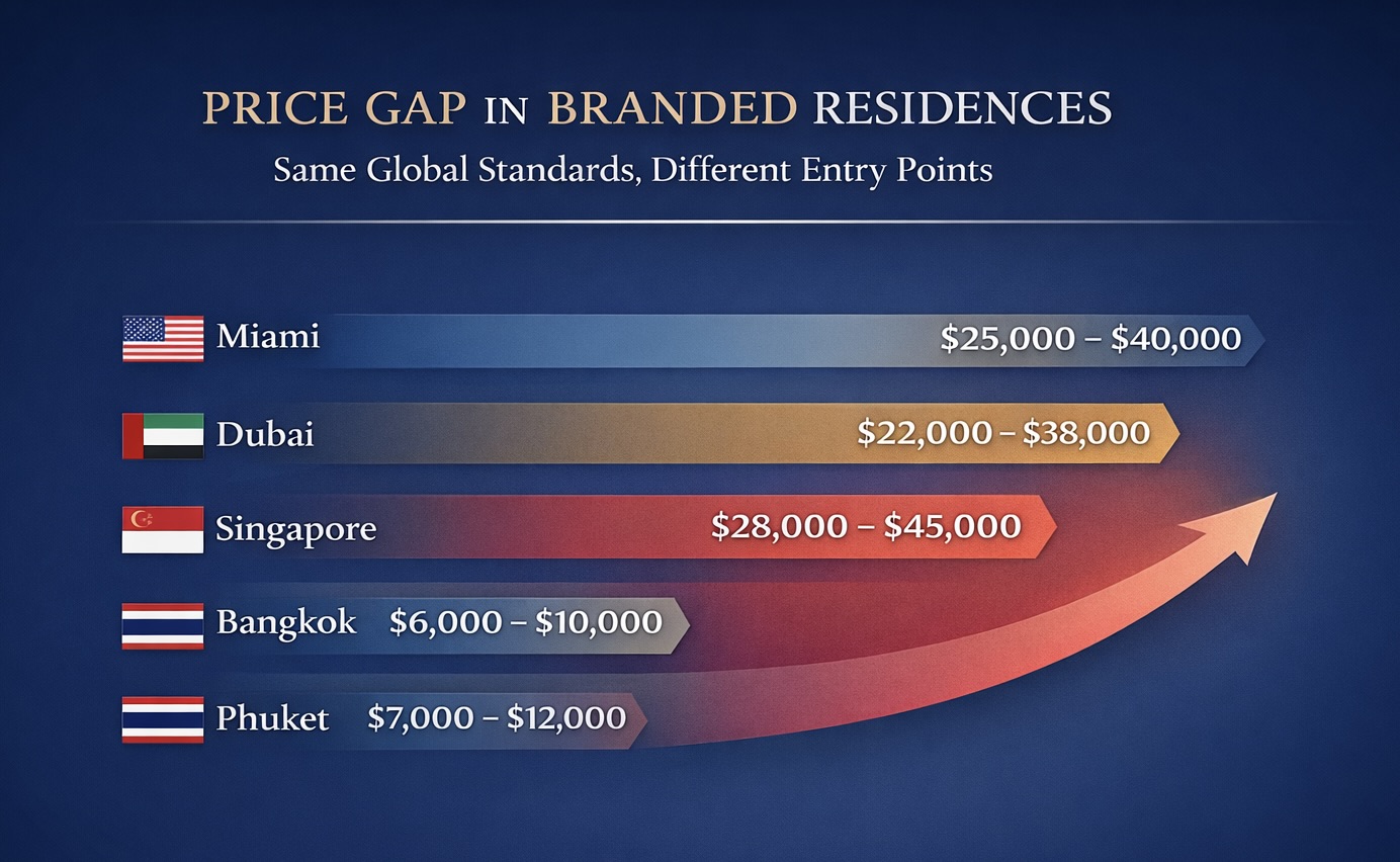 Thailand–particularly Bangkok and Phuket–continues to offer significantly lower entry pricing compared to mature global markets such as Miami, Dubai, and Singapore, despite comparable brand standards and service quality.