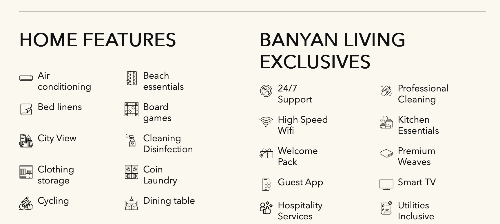 - Unit allocation is subject to availability; furnishings and décor may vary slightly, maintaining Banyan Livings quality standards