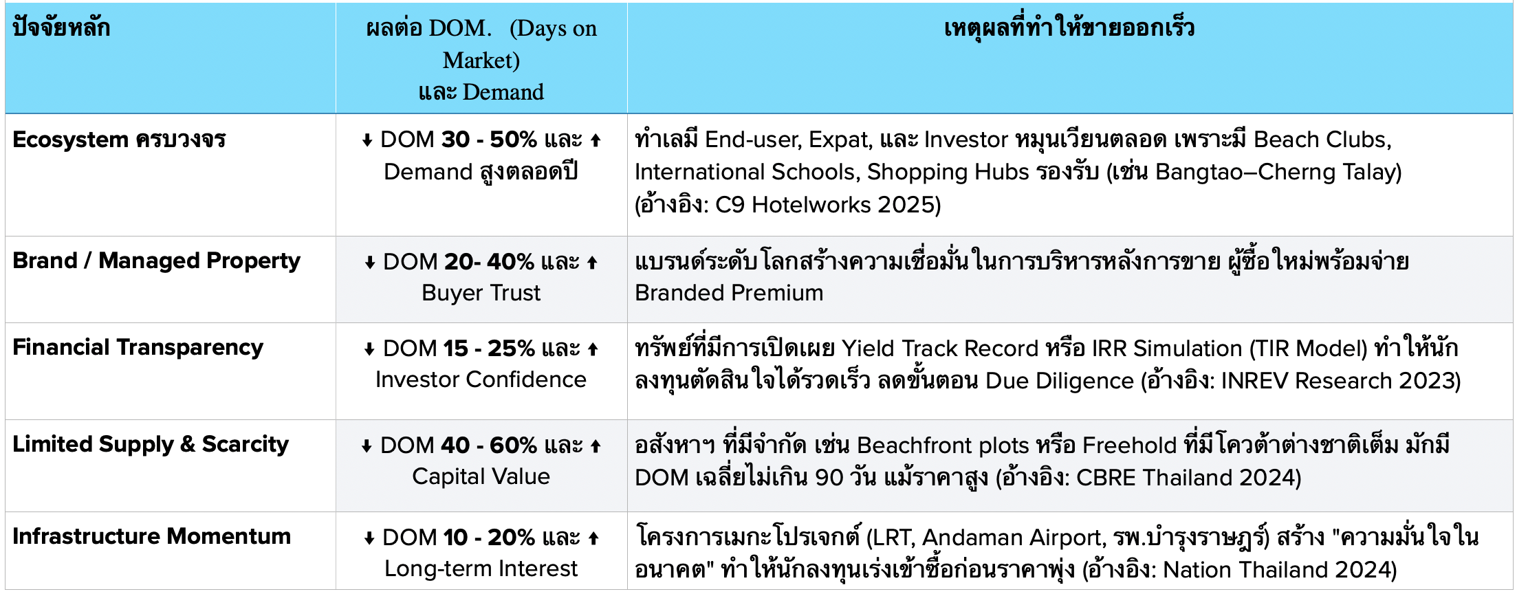 ความเร็วในการขายออก (DOM) Days on Market และความต้องการซื้อ (Demand) มีความสัมพันธ์โดยตรงกับปัจจัยเชิงโครงสร้างที่อยู่เบื้องหลัง หากคุณต้องการให้ทรัพย์สินมีสภาพคล่องสูง